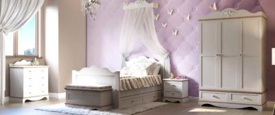 Детская Мисс Флауэр (Miss Flower) от Аква Родос - это мебель для юных принцесс. Романтичная и нежная, светлая и уютная! Увидев эту мебель, вы окунетесь в атмосферу непревзойденной романтики. Плавные обтекаемые формы, закругленные детали и безопасные ручки предохраняют ребенка от травм. Кровать, входящая в состав коллекции, может быть оборудована выкатным ящиком для хранения белья и игрушек. В производстве детской использованы исключительно натуральные и экологически чистые материалы. Ручки изготовлены из фарфора.