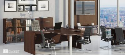 Особенность кабинета Глосс - утонченная легкость столешниц столов за счет контрастной отделки в сочетании с толстыми опорами. Это подчеркивает изысканность и элегантность всей коллекции кабинетной системы Глосс.
