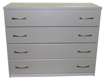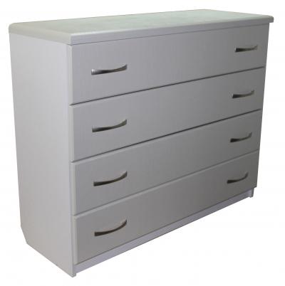 Комод К001 имеет четыре выдвижных ящика одинаковой высоты. На каждом фасаде установлены по две матовые ручки обтекаемой формы.