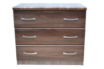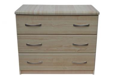 Комод К002 имеет три выдвижных ящика одинаковой высоты. На каждом фасаде установлены по две матовые ручки обтекаемой формы.