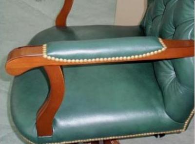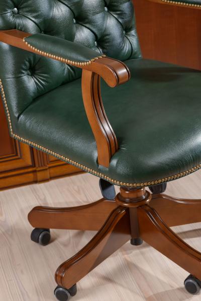 Спинка кресла декорирована специальной стёжкой-капитоне. Подлокотники выполнены из натурального дерева (массива бука) и дополнены кожаными мягкими накладками. Контуры кресла оформляются окантовкой из декоративных мебельных гвоздиков.