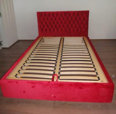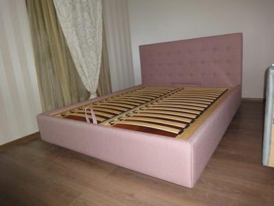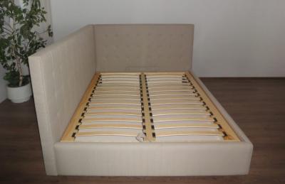 - Основание – конструкция из деревянных брусков и плиты ДСП. Внутри кровати короб, используемый и как ниша, и как элемент, дополняющий прочность конструкции. Изголовье кровати – ДСП с настилом из пенополиуретана;