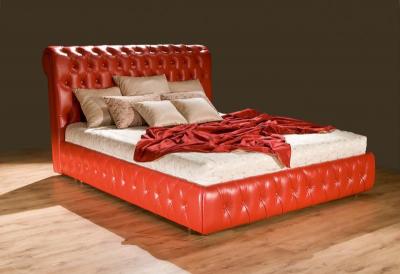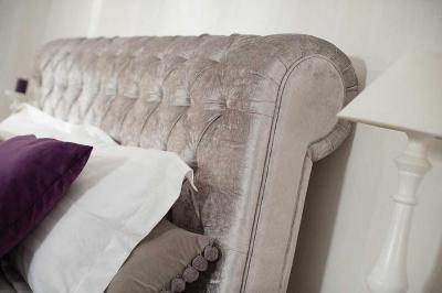 Высокая пикированная спинка кровати Болеро (Bolero) прекрасно гармонирует с царгами кровати, опоясывающими её по периметру высоким и узким карнизом. Каркас изголовья выполнен из натурального дерева - ольхи, а царги - из плиты ДСП. Вся конструкция слегка приподнята над уровнем пола на декоративных слегка заметных металлических опорах. Мягкая подкладка царги придаёт элементам мебели объёмность и делает кровать удобной и безопасной в эксплуатации. По всей плоскости она, как и изголовье пикирована декоративными пуговицами кровати. Наполнение изголовья - пенополиуретан.