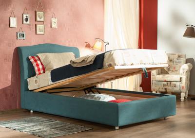- Кровать комплектуется ламельной сеткой из натуральной древесины или сеткой на металлическом каркасе, которая подымается с помощью газового подъемника и открывает доступ к нише для постельных принадлежностей;