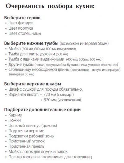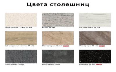 Кроме фасадов и столешницы (на фото), вы можете выбрать по своему вкусу другие (из перечня производителя). Фурнитура - на выбор заказчика.