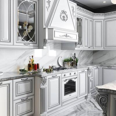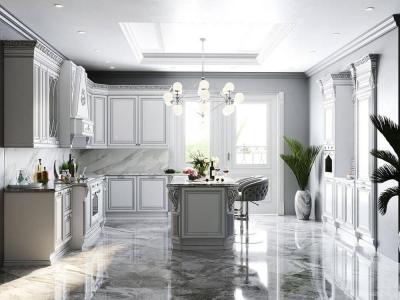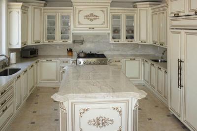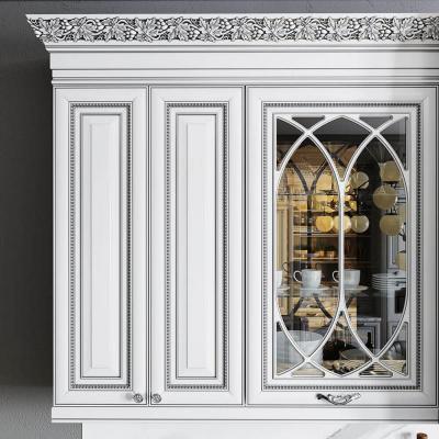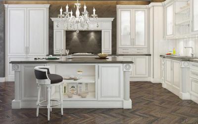 Изюминка кухни – изящные глянцевые ручки, инкрустированные кристаллами Swarovski, что подчёркивает богатство серебряной патины.