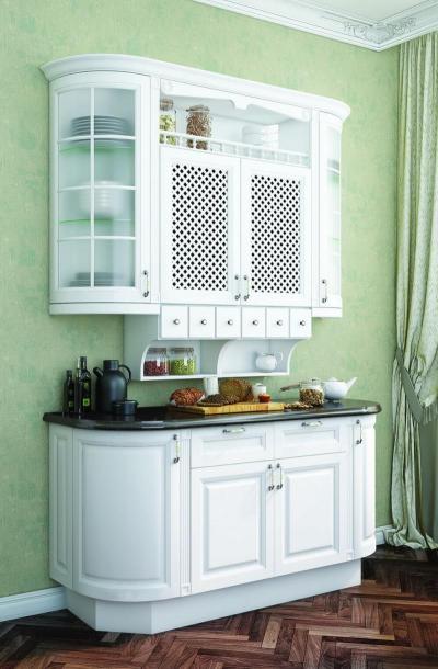 Вместо глухой филёнки в рамку может вставляться матовое стекло – цельное или состоящее из отдельных элементов, собранных с помощью металлических элементов, а также специальная решетка – для секций, предназначенных для размещения и сушки посуды.
