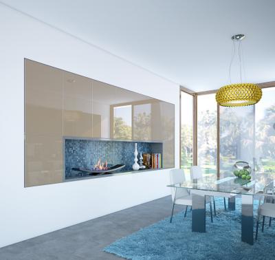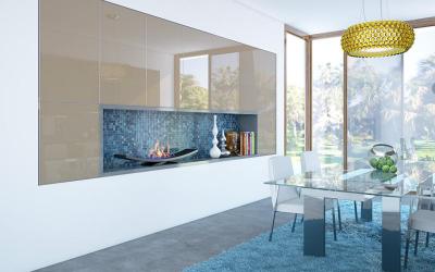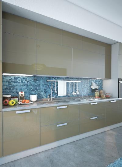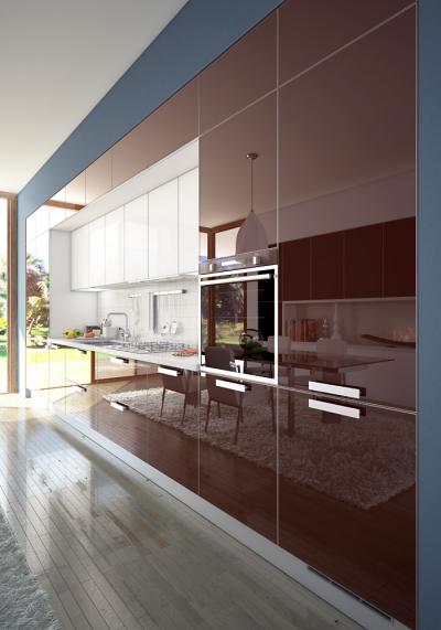 Фасады кухни изготавливаются по современной технологии и представляют собой крашенное стекло в алюминиевой рамке.