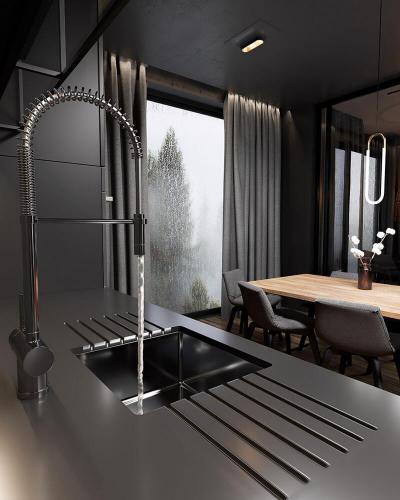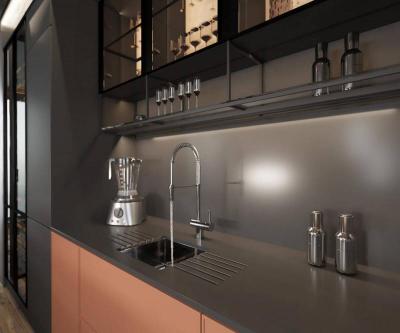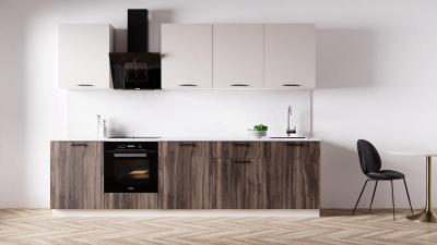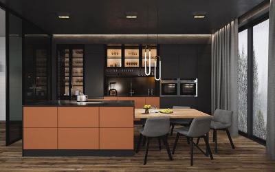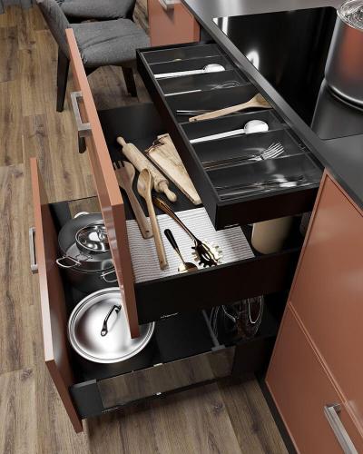 Гармоничное сочетание светлых и тёмных цветов, оригинальный дизайн фурнитуры и аксессуаров, а также тщательно продуманная и воплощённая система хранения кухонной утвари и продуктов – всё это не позволит оставить без вашего внимания ни малейший уголок вашего рабочего пространства.