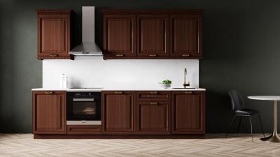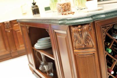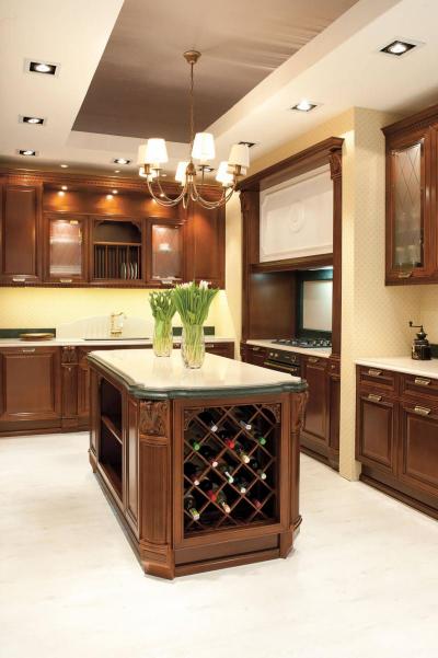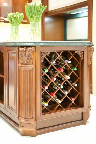Фасады с покрытием в одном цвете производятся из массива натурального дерева – ольхи. Они специально тонируются в цвет «орех», после чего их поверхность покрывается защитным лаком и патиной.