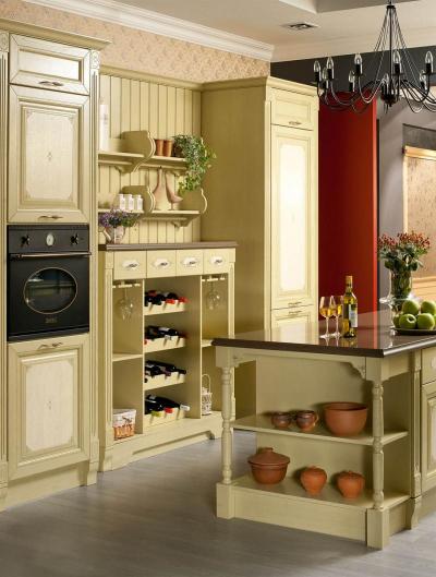Дополнительный шарм и очарование кухне Прованс (Provence) придают различные декоративные элементы: витражные стёкла, разнообразные пилястры, балюстрады и карнизы.