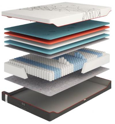 - Ortho Foam - пенообразный материал с эффектом памяти. В структуре материала имеются ячейки разного размера, по разному реагирующие на нагрузку. При малых нагрузках материал комфортен, но с увеличением давления его сопротивление меняется нелинейно, чем обеспечивается лучшая поддержка позвоночника. Благодаря этим уникальным качествам, материал с успехом используют как основу в беспружинных матрасах.