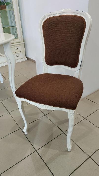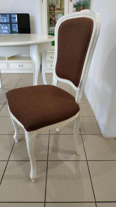 Материал, из которого выполнена столовая группа Ривьера - натуральное дерево с покрытием цвета "античный беж". Сиденья стульев - ткань коричневого цвета.