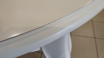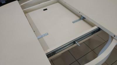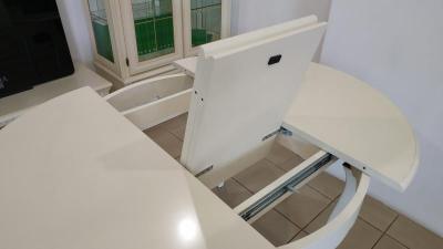Обеденная группа Ривьера включает в себя стол с овальной столешницей размером 1600*1100 мм (за счёт вставки в средней части стола длина может увеличиваться на 500 мм) при высоте стола 760 мм и стулья с размерами сиденья 460*500 мм и спинкой высотой 980 мм (от пола).