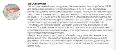Выполнена из нового материала - ViscoMemory, обладающегот хорошим эффектом памяти. Также этот материал обеспечивает необходимый ортопедический эффект. Это улучшает качество сна и отдыха. Используются экологически чистые материалы.