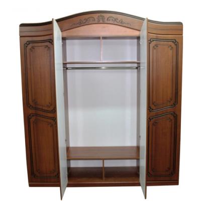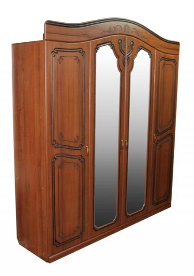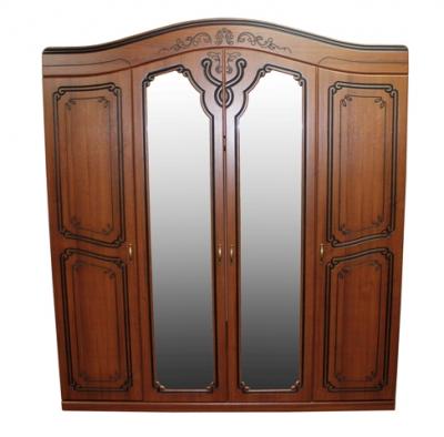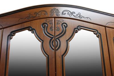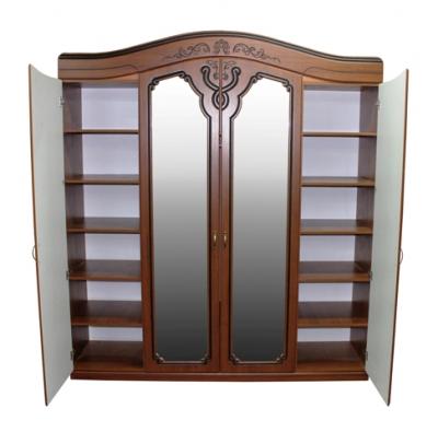 Шкаф гарнитура спальни Альба орех (2000*2300*500) имеет четыре двери, две центральные из которых зеркальные. Вверх шкафа обрамлен изогнутым изящным карнизом.