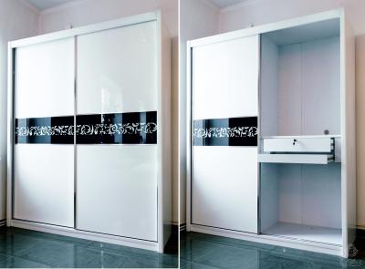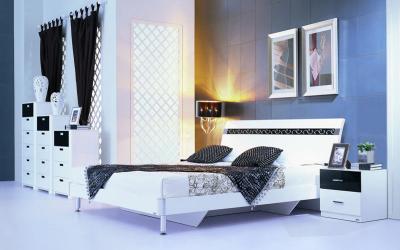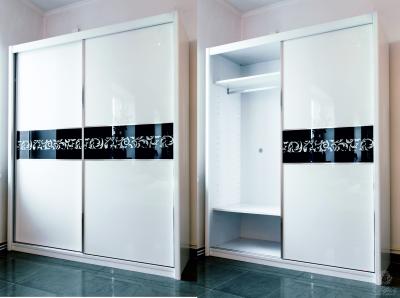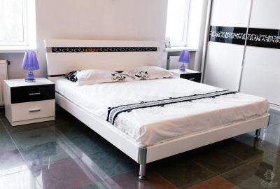 Спальня Ажур от Мир Мебели София в стиле модерн покрыта устойчивой глянцевой краской двух цветов: чёрного и белого. Чёрный цвет придаст строгости интерьеру, белый - добавит света, хромированные детали - современности, а растительные узор на изголовье кровати и фасадах шкафа - романтизма.