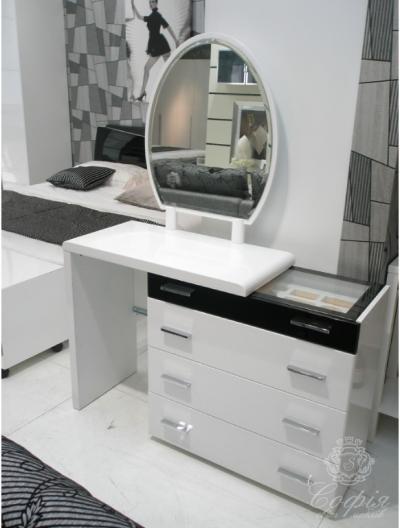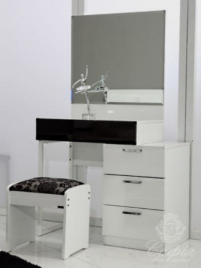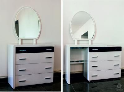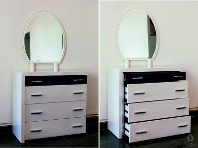Комод с зеркалом Ажур (810*400*1520 мм) покрыт устойчивой белой и чёрной глянцевой краской. Цвет комода привносит легкость в интерьер, а хромированные детали – современность.