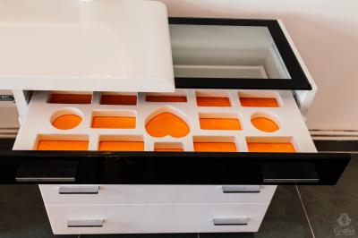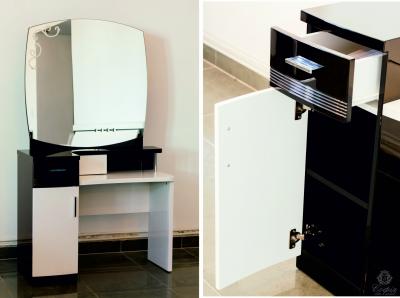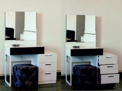 Туалетный столик с зеркалом Ажур выполняется в двух размеров: 900х420х1470 мм и 900*390*1550 мм, что позволит вам дополнить ним спальню любого размера. Внутренние отсеки вместят множество милых сердцу штучек или же средств по уходу.