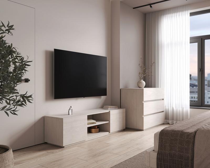 Стильна та практична тумба за рахунок лаконічного дизайну органічно доповнить інтер’єр сучасної спальні, наприклад, в еко стилі.