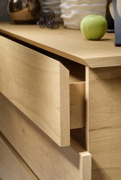 Кроме того, в комплект спальни Модерно (Moderno) шпон входит комод на три ящика, в которых можно хранить постельное белье, полотенца и другие спальные принадлежности. Над комодом дизайнеры советуют разместить зеркало в деревянной раме.