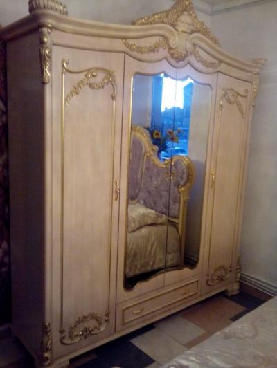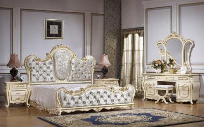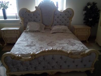 Спальня Монако от Мир Мебели София покрыта устойчивой молочно-белой глянцевой краской. Молочно-белый цвет добавит света в интерьере, элементы декора из сусального золота - роскоши, обтянутая бархатом спинка кровати и пуф - уюта, а традиционные резные детали - утончённости.
