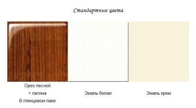 - Стандартные цвета - орех лесной с глянцевым лаком + патина, эмаль белая, эмаль крем 0103, емаль сирень;