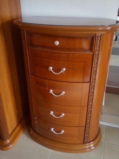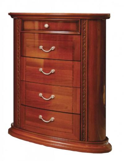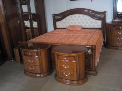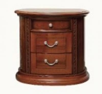 Прикроватные тумбы (690*440*630 мм) выделяется полукруглой формой и резным декором. Полукруглая форма делает мебель аккуратной и изящной. Латунная фурнитура сочетается с мебелью. Фасады украшены оригинальным рисунком.