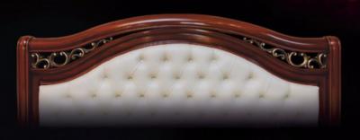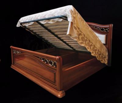 Кровать (1860*2160*1450 мм, 2040*2160*1470 мм) с подъемным механизмом станет не только удобным местом для отдыха, но и местом для хранения постельного белья и подушек. Изголовье и изножье привлекают одинаковым резным декором, покрытым позолотой. Эффекты браширования и патинирования подчеркивают деревянную текстуру кровати.