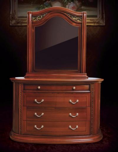 Комод с зеркалом (1360*530*1950 мм) состоит из 4 больших и одного маленького ящика. Зеркало имеет прямоугольную форму, а в верхней части расположен оригинальный декор, который сочетается по стилю с изголовьем кровати. Комод Валенсия легко станет альтернативой туалетному столу.