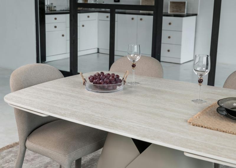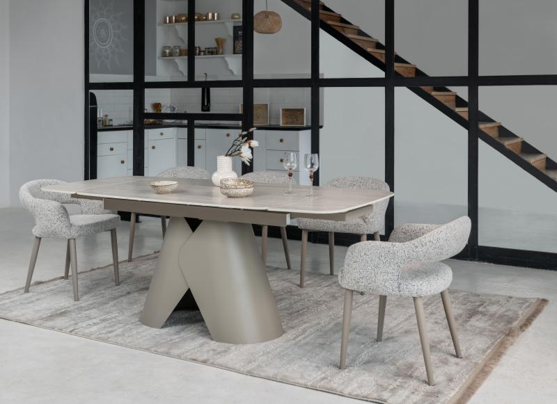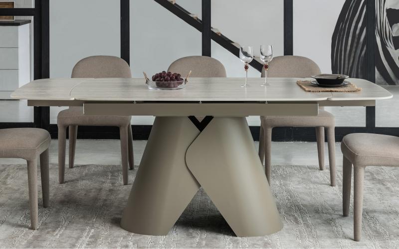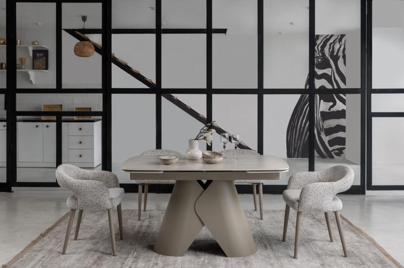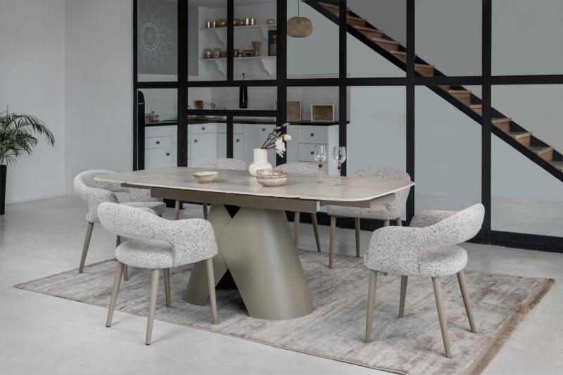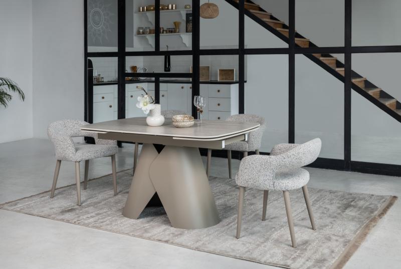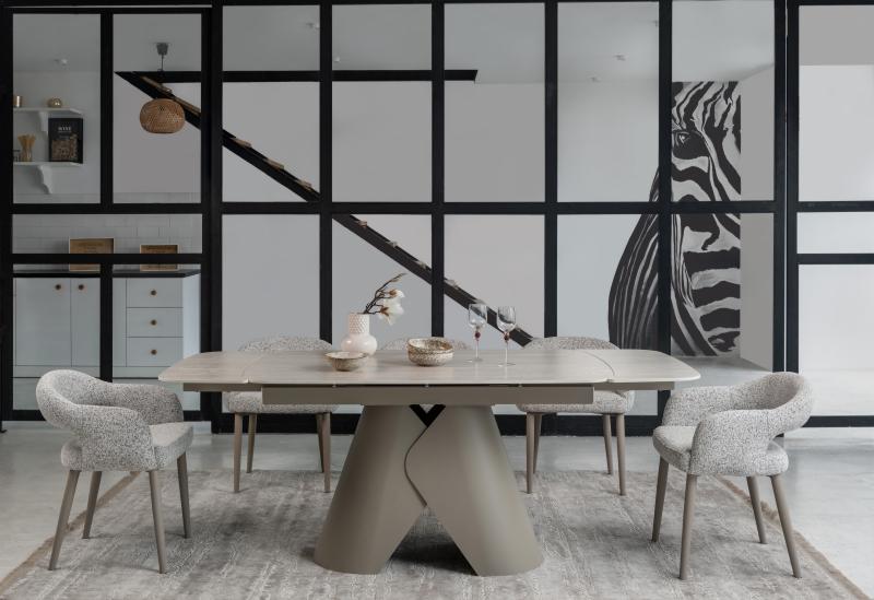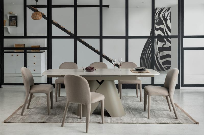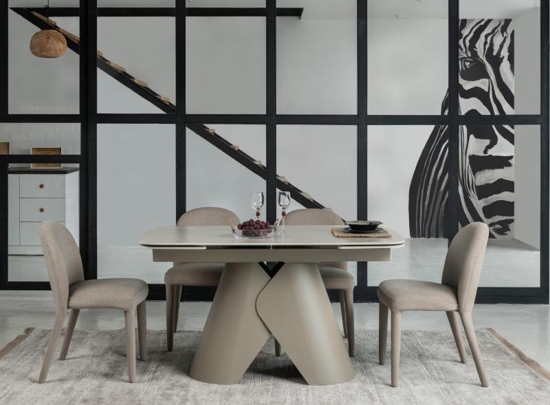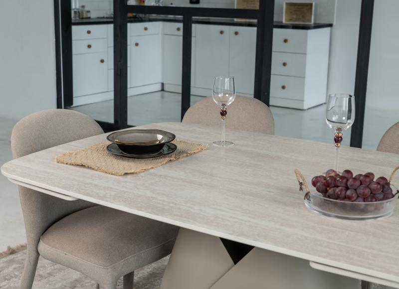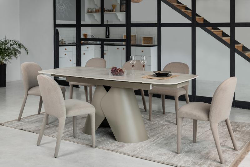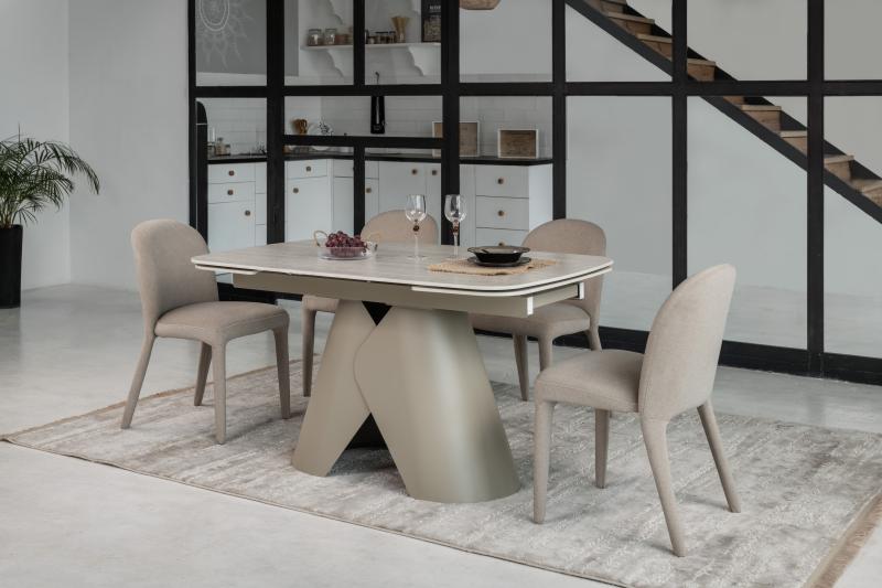 , пофарбована у благородний бежевий колір, забезпечує надійну стійкість та гармонійно доповнює дизайн. Завдяки стіл легко трансформується з 140 до 200 см, що дозволяє зручно розмістити гостей під час святкових зустрічей.