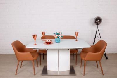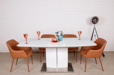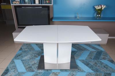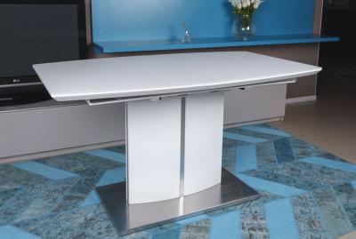 Стол Даллас имеет оригинальную форму опоры, декорированную металлическими вставками из нержавеющей стали. Опора выполнена из МДФ, окрашенного в белый цвет. Завершает композицию массивное основание из нержавеющей стали, которое придает всей модели солидность и устойчивость.