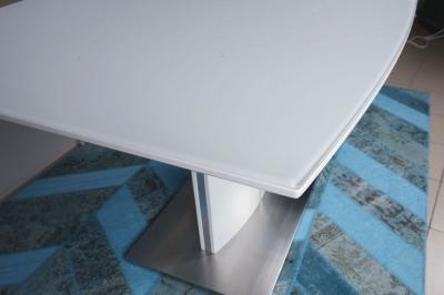 Столешница стола Даллас выполнена из МДФ, окрашенного в белый цвет. Сверху закреплено каленое стекло толщиной 10 мм. Технология изготовления стекла такова, что стекло является безопасным даже в случае его разбития. Кроме того, на нем не остается следов от пальцев и разводов от тряпки, что очень нравится хозяйкам.