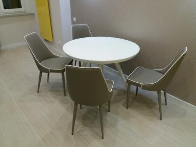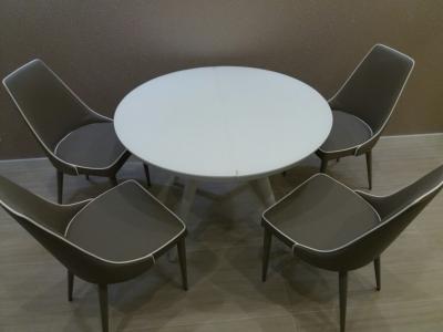 Диаметр столешницы в собранном виде – 110 см. Раздвижной механизм по типу «бабочки» обеспечивает увеличение размеров стола до 145 см в диаметре. Полезная площадь увеличивается за счет вставок из МДФ, окрашенного в модный цвет «мокко». Ножки стола Остин сделаны из нержавеющей стали с напылением.