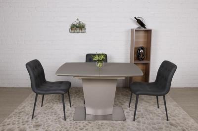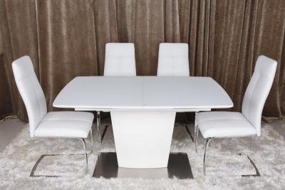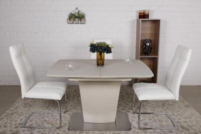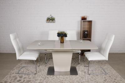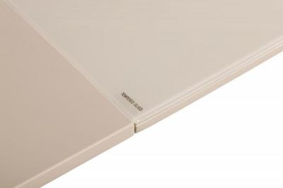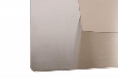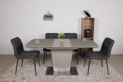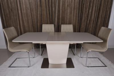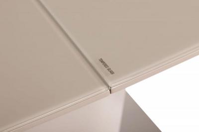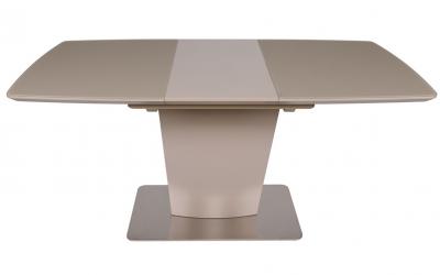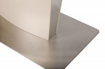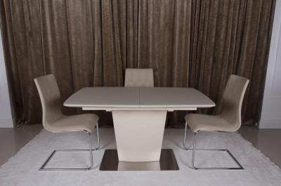 Стол Чикаго (Chicago) сделан из МДФ, окрашенного в цвет капучино. Столешница выполнена из каленого стекла толщиной 10 мм, а основание – из нержавеющей стали. Раскладной механизм по принципу «бабочка» очень надежный, изготовленный из металла. Увеличение размеров столешницы достигается за счет двух панелей из МДФ.