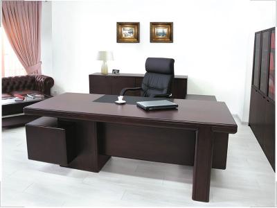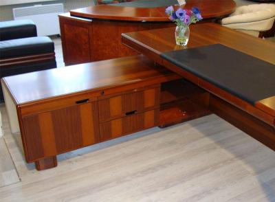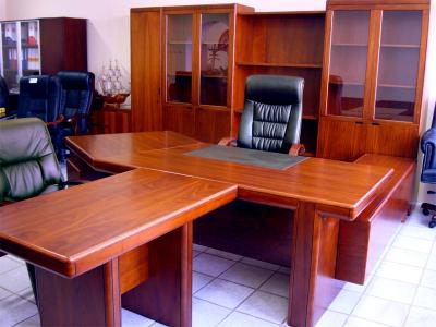 Мебель выполнена с использованием шпона, дерева, кожи и МДФ. Обкладка торца столешницы изготовлена из деревянного массива. Цвет - вишня, орех, палисандр.