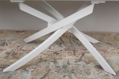 Столешница выполнена из каленого стекла белого цвета толщиной 10 мм. Изюминка модели заключается в том, что сквозь стекло просвечивается раскладной механизм и элементы крепления столешницы. Стол производит впечатление предмета мебели из будущего, или, как минимум, с космической орбитальной станции.