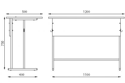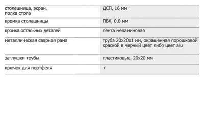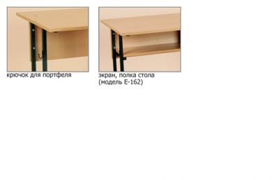 Стол ученический Е-161 снабжен экраном и крючками для подвешивания ученического портфеля. Столешница и экран стола выполнены из ДСП толщиной 16 мм. Кромка столешницы - ПВХ, 0.8 мм, кромка остальных деталей - лента меламиновая. Разборная металлическая рама изготовлена из трубы 20х20х1 мм и может быть окрашена порошковой краской в чёрный либо алюминиевый цвет.