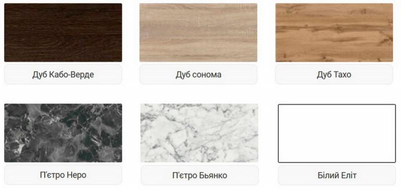 Колір стільниці: дуб Кабо-Верде, дуб Тахо, дуб Сонома, білий Еліт, петра Б'янко /Петра Неро, бетон світлий/бетон темний
