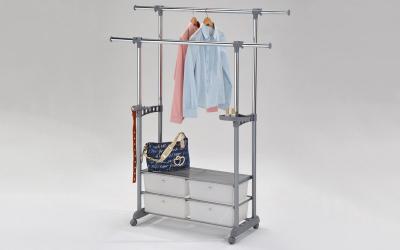 Стойка для одежды W-69 (CH-4618) с ящиками. Удобное изделие, прекрасно подойдет для гардеробной комнаты, студий и агентств. Две горизонтальные разновысокие перекладины соединяются воедино металлическим основанием. Внизу изделия имеется блок выдвижных ящиков (4 шт.).
