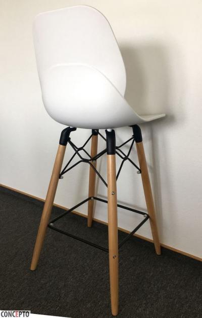 Стальной каркас стула способен выдерживать нагрузку до 150 кг. Деревянные ножки изготовлены из светлого бука, который прекрасно сочетается с белым цветом сиденья стула. На контрасте играет черный металл каркаса и подножек, а интересный дизайн металлической рамы является изюминкой этой модели.
