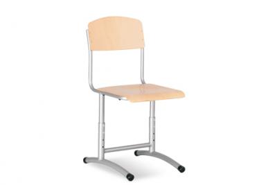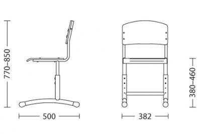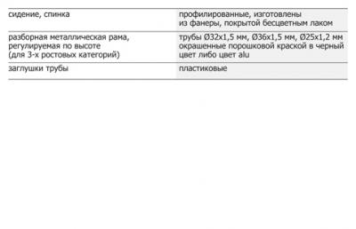 Имеет профилированные спинку и сидение, которые изготовлены из лакированной фанеры. Регулируемая по высоте металлическая рама предназначена для 3-х ростовых категорий.