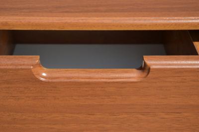 Тумба прикроватная П002 имеет два выдвижных ящика одинаковой высоты. На каждом фасаде установлены по две матовые ручки обтекаемой формы.