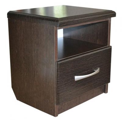 Тумба прикроватная П003 имеет открытую полку и один выдвижой ящик. На фасаде установлена матовая ручка обтекаемой формы.