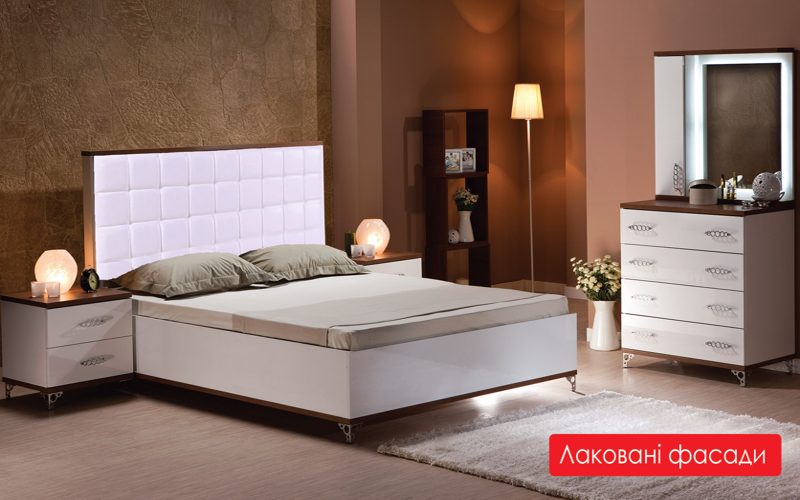 Эта спальня выполнена в современном стиле. Лакированные фасады наполнят ваш дом особым светом и теплом. Особое преимущество модели: высокое мягкое изголовье кровати. Такое изголовье оценят все, кто любит читать или смотреть телевизор в спальне.
